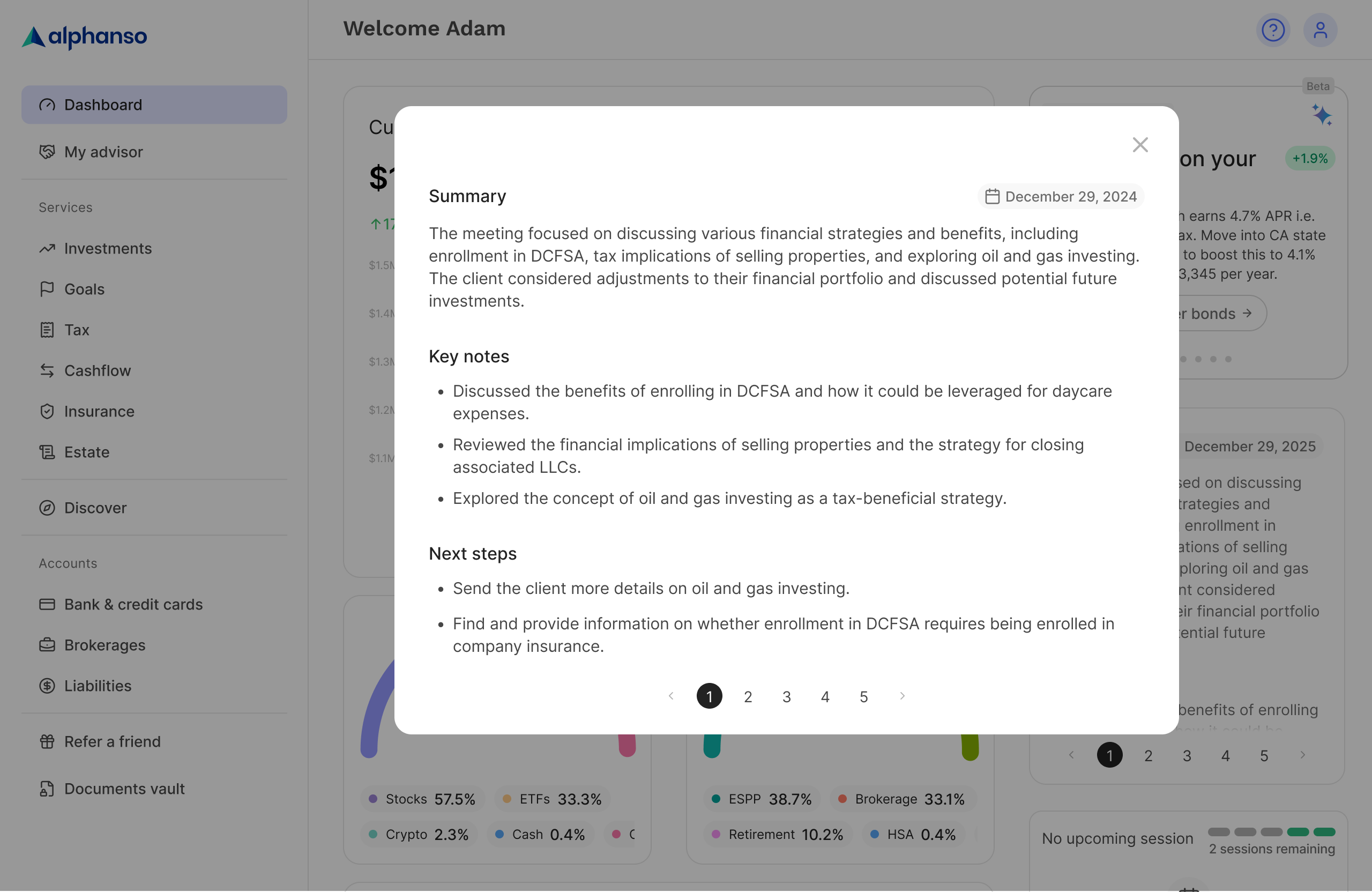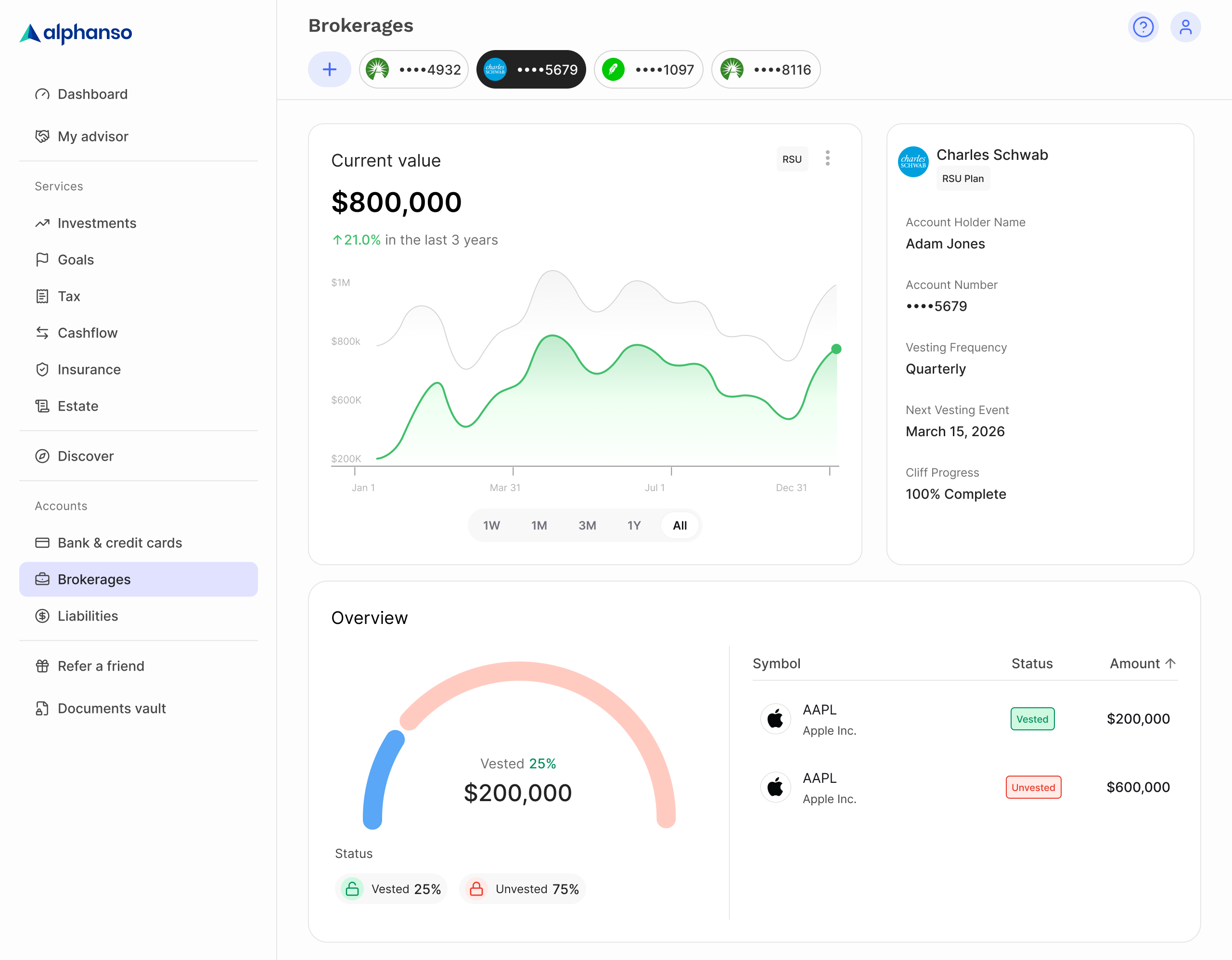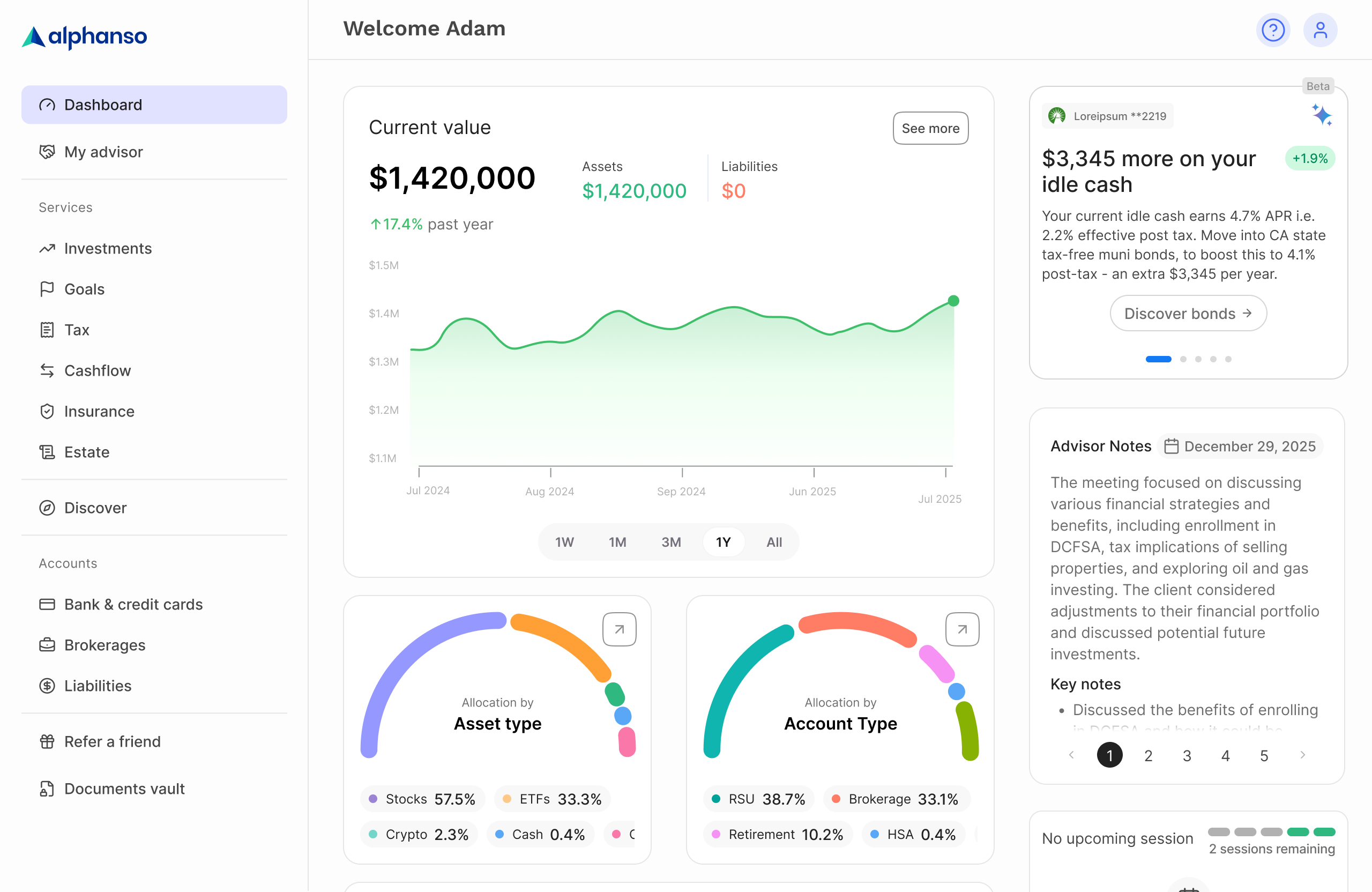 When you open Alphanso, the dashboard shows your net worth across your entire financial picture.