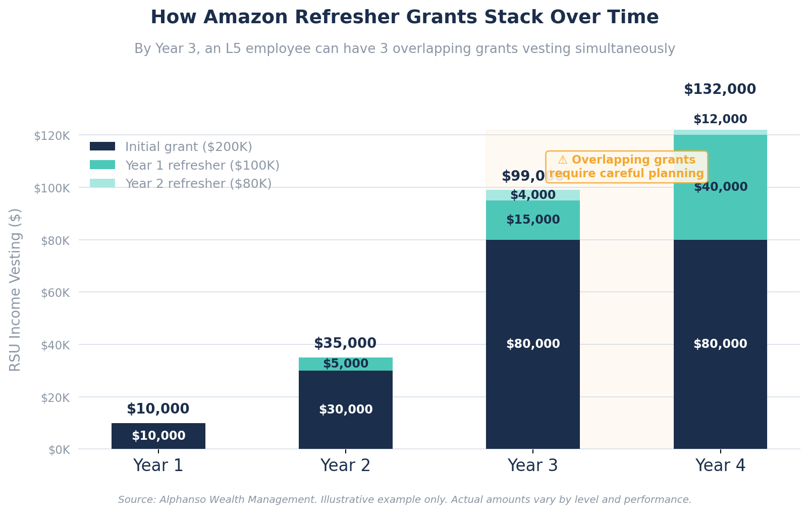 This creates a compounding effect. An L5 who received a $200,000 initial grant and a $100,000 Year 1 refresher will have roughly $80,000 + $5,000 = $85,000 vesting in Year 3 from those two grants alone — plus any Year 2 refresher kicking in. The overlapping vesting schedules make income volatile and hard to predict without a spreadsheet (or an advisor who builds one for you).