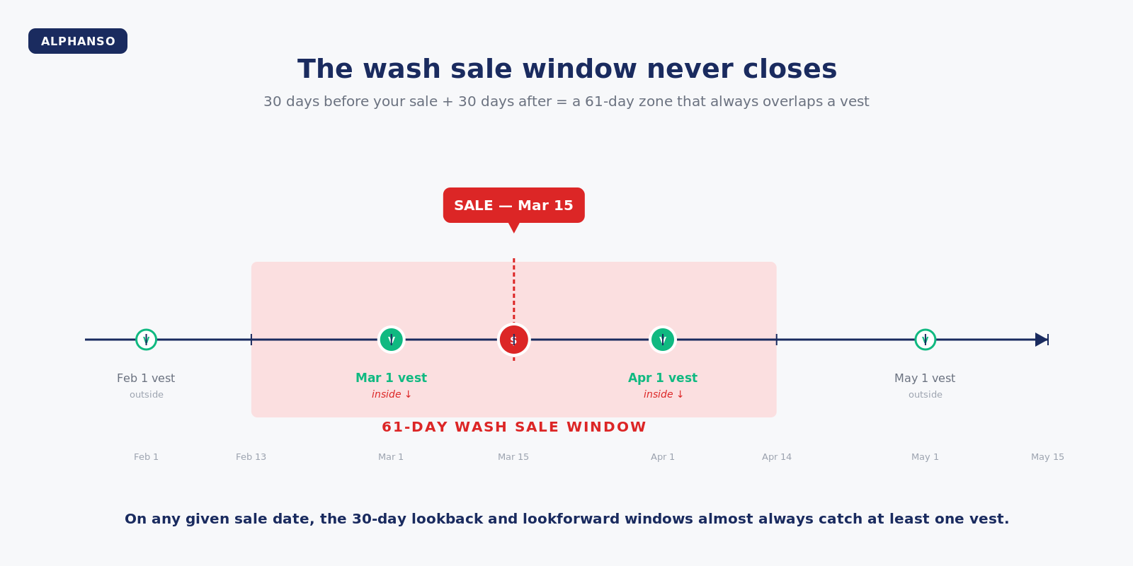 Even if you had sold on March 3rd — just two days after the vest — the March 1st acquisition is within 30 days. Wash sale.